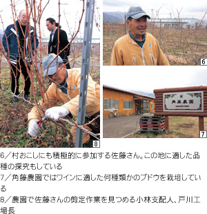 20歳で家業の農家を継いだ佐藤さん。大手酒造メーカーが指定する品種のブドウ栽培を手掛けていたものの、当時、「納得できるワインの味ではなかった」と、垣根式で栽培する欧州系のピノノワールとシャルドネの栽培を自らかって出た。その後、出荷したシャルドネが1997年に世界ワインコンクールで金賞を受賞。それまで試行錯誤を繰り返してきた栽培方法に確信を得た。3年前には佐藤さんが指導者となって「高山村ワインぶどう研究会」も発足し、村おこしに取り組んでいる。